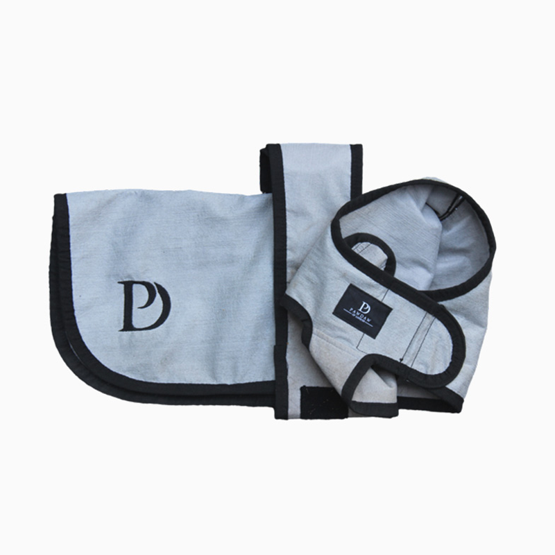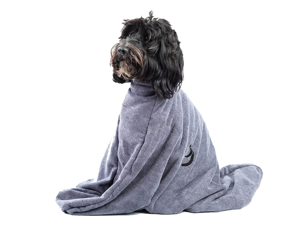 We have developed a super-absorbent premium microfibre, that will not only dry Phoebe, but it will also remove the mud or sand from her fur. Her paws are contained within the luxury drying bag, perfect for keeping our car seats clean and Phoebe safe on the journey home. The fully adjustable Velcro neck strap keeps her secure and we can fasten a seat belt clip through the unique harness hole to her collar or harness. It really has changed our lives and know it will be a game changer for you too.
