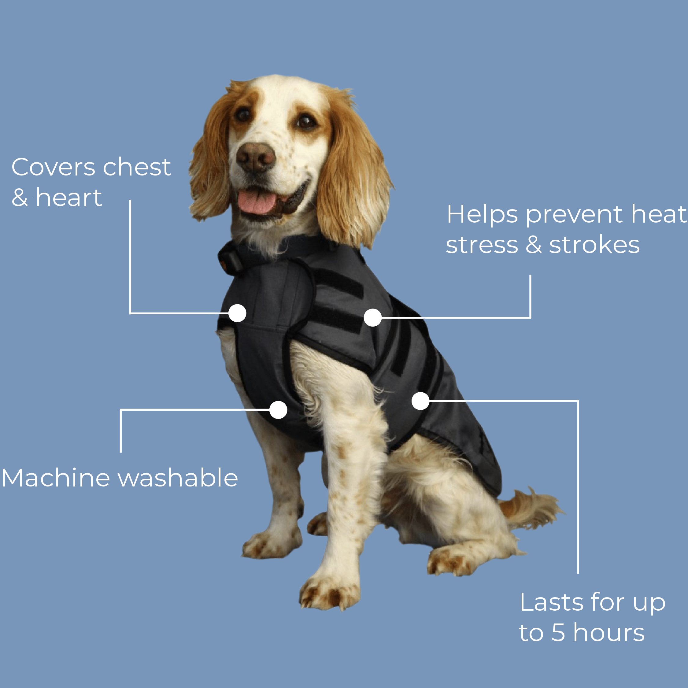 No need to re-soak every hour, it stays cool for at least 5 hours. Our cooling coats won't dry stiff, they stay soft and comfortable, reducing the risk of rubbing or irritation on your dog’s skin or overheating. Your dog can even chill out in the shade in their cool coat or in the car whilst travelling!