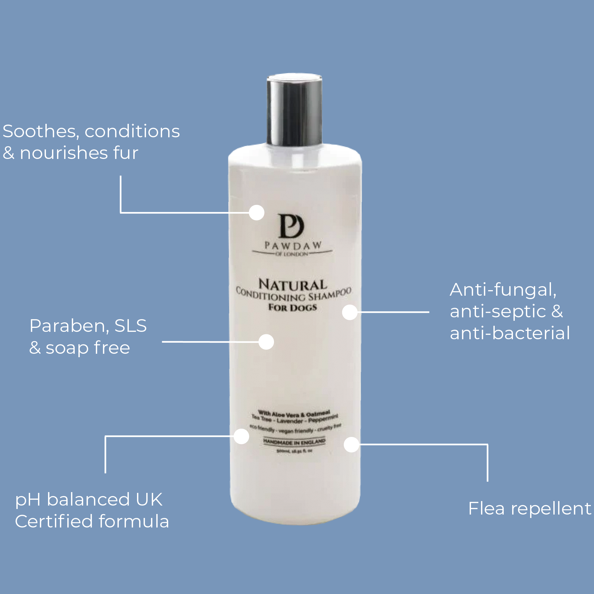 We understand the importance of caring for dogs with sensitive skin. Our Natural Conditioning Shampoo with Aloe Vera is meticulously crafted with natural ingredients, including Tea Tree for its antiseptic, anti-inflammatory, and anti-fungal properties. Moreover, we have excluded harmful preservatives like Paraben and SLS, ensuring the utmost safety for your pet's eyes, skin, and coat. Trust in the power of nature to provide gentle care and protection. However, if your dog suffers with skin flare ups, we recommend our Natural Sensitive Shampoo with Chamomile if the condition is serous, we advise speaking to your vet first.