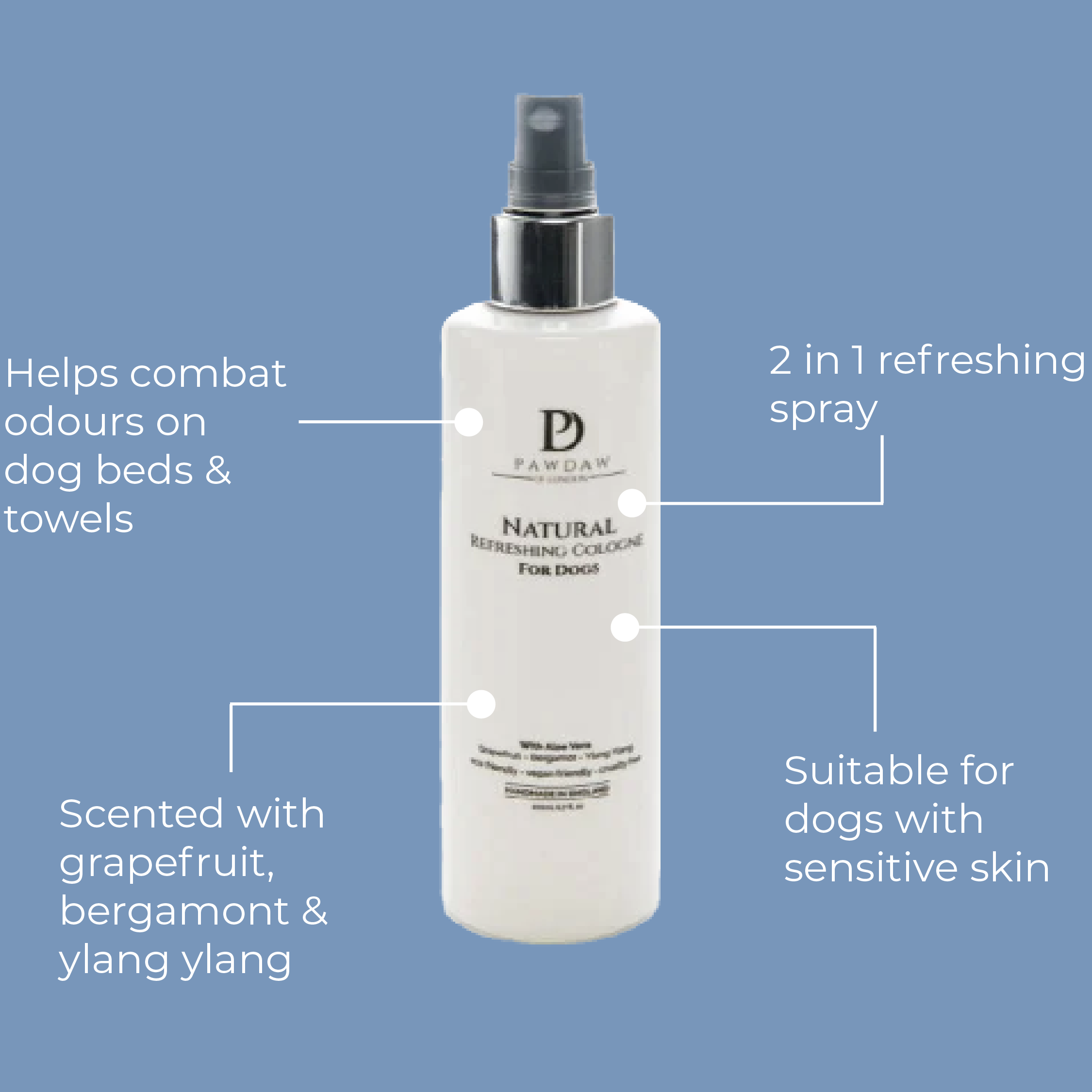 The cologne is a refresh spray which can be applied to your dog’s coat or bedding as required, you can use daily, or after a bath, whenever you feel their fur needs a bit of a freshen up.